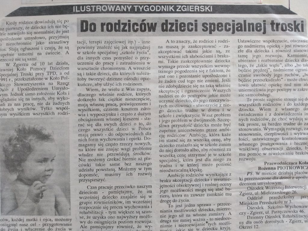 01.09.1991 Zostaje powołana pierwsza placówka Stowarzyszenia Ośrodek Wczesnej Interwencji dla dzieci z zaburzeniami w rozwoju w wieku 0-