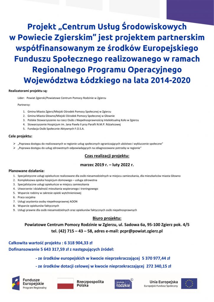 Projekt „Centrum Usług Środowiskowych w Powiecie Zgierskim” jest projektem partnerskim współfinansowanym ze środków Europejskiego Funduszu Społecznego realizowanego w ramach Regionalnego Programu Operacyjnego Województwa Łódzkiego na lata 2014-2020