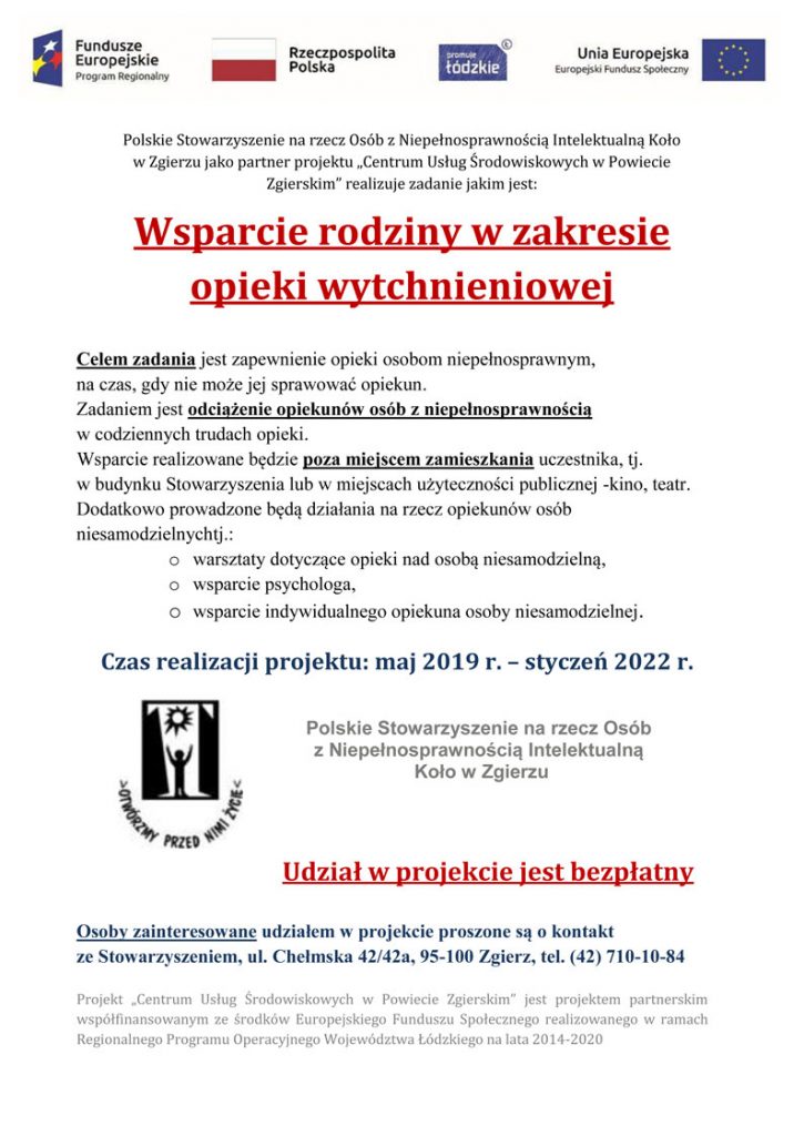 Polskie Stowarzyszenie na rzecz Osób z Niepełnosprawnością Intelektualną Koło w Zgierzu jako partner projektu „Centrum Usług Środowiskowych w Powiecie Zgierskim” realizuje zadanie jakim jest: